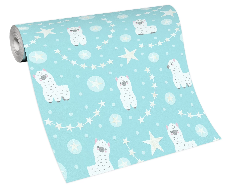 Kindertapete 10161-18 aus der Kollektion Sweet and Cool von Erismann mit Alpaka-Motiv in türkis mit Glitzer